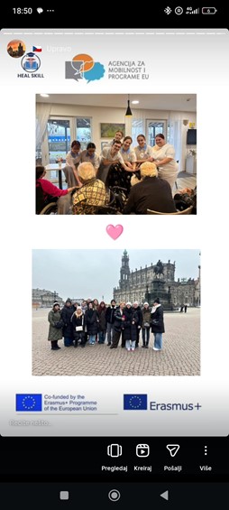 U projektu HEAL SKILL – mobilnost u Pragukoji je trajao od 19. do 31. siječnja 2026. godine sudjelovalo je 12 učenika, smjer: medicinska sestra opće njege/medicinski tehničar opće njege – četvero učenika trećih, četvrtih i petih razreda te tri nastavnice u pratnji: Ivana Debelić, Branislava Laurović i Maja Rakin.  Učenici su praksu obavljali u  Domov tretiho veku  u kojem su ih lijepo dočekali i prihvatili. Centar za zdravstvene i socijalne usluge Domov tretiho veku od travnja 2019. godine pruža usluge Doma za starije osobe kao dio svojih socijalnih usluga, a od srpnja 2020. godine Dom je proširio djelatnost i na usluge zdravstvene poslijeoperacijeke skrbi i rehabilitaciju. Jedna je to od najmodernijih ustanova toga tipa s ukupnim kapacitetom 110 kreveta od kojih je 12 korisnika s Alzhaimerovom bolešću, senilnom demencijom ili drugim vrstama demencije iz područja neurologije ili psihijatrije.
